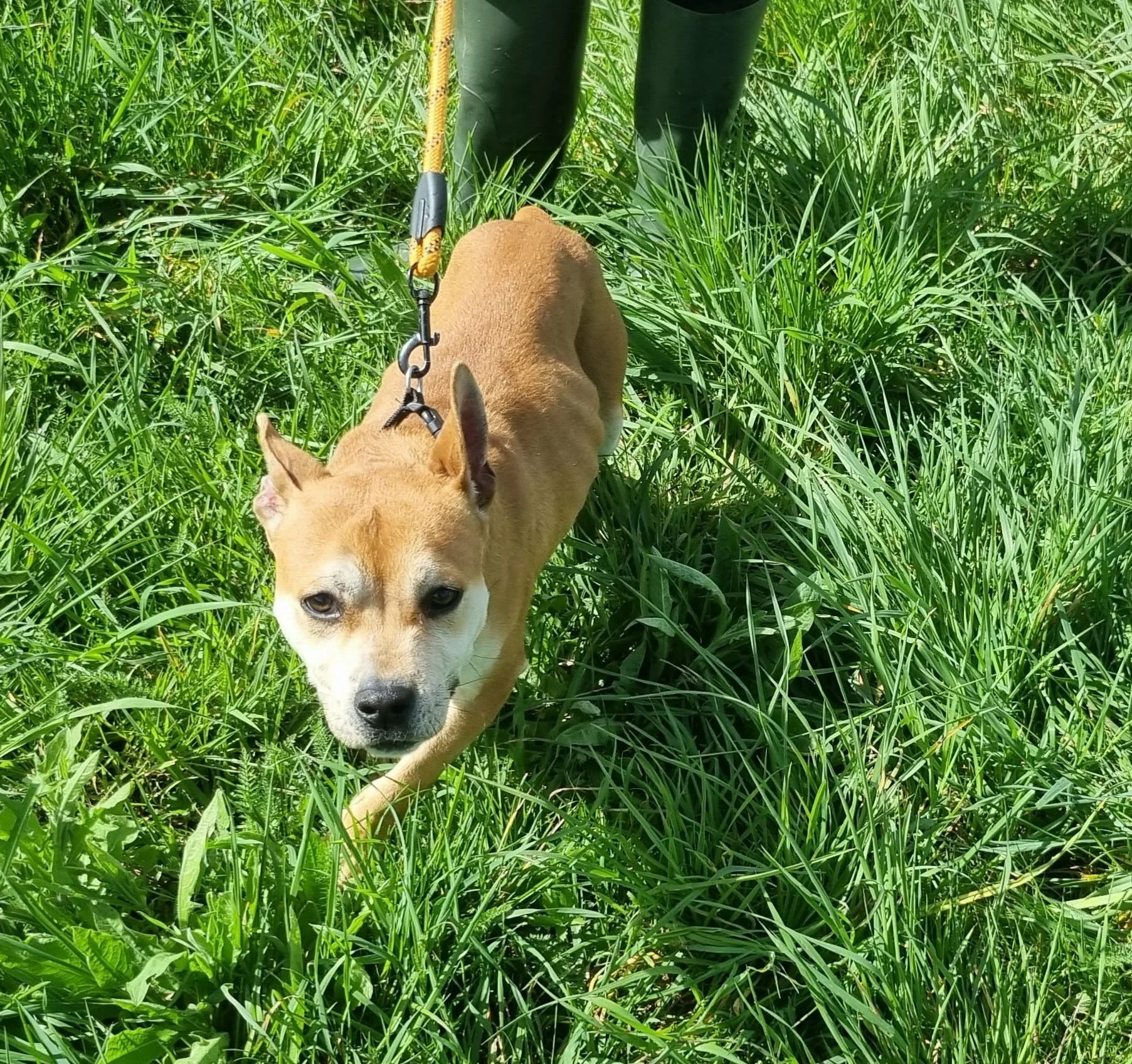 Alvin, croisé staffy né en mars 2025, un peu timide mais joueur